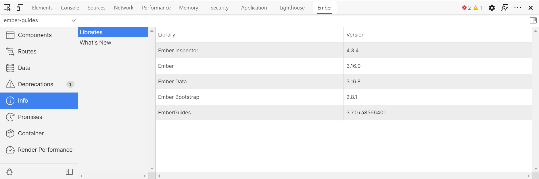 The Info tab shows some of the libraries used in your application, along with their version.